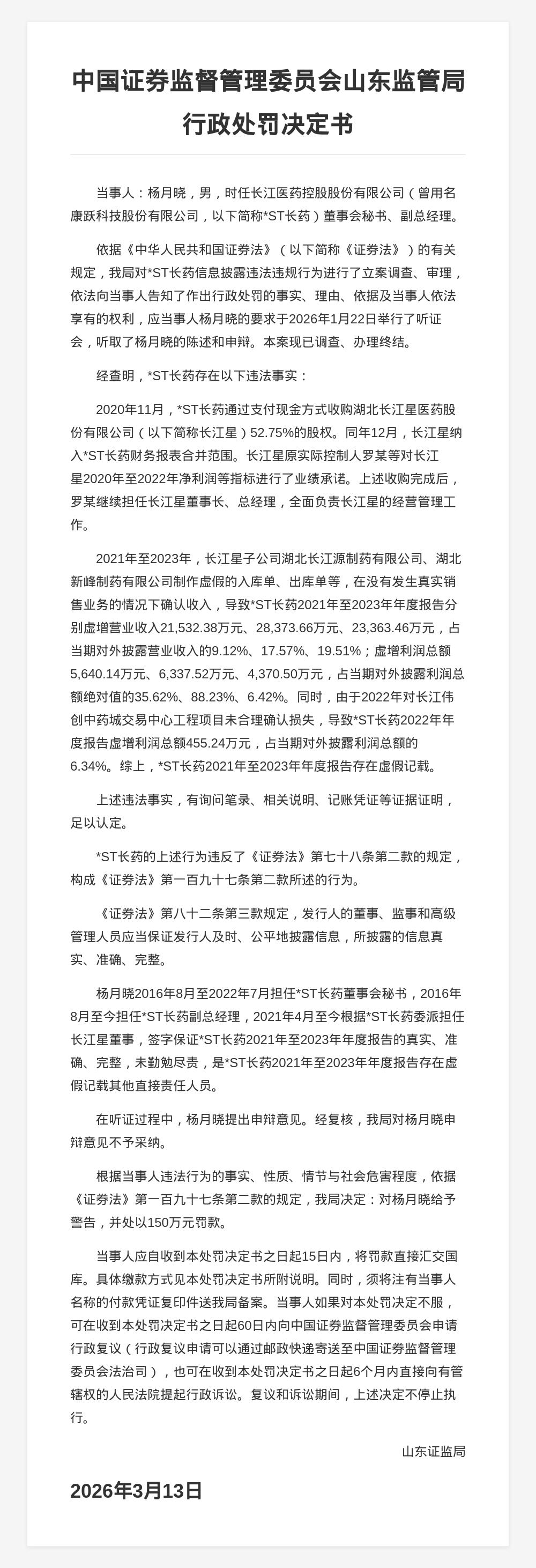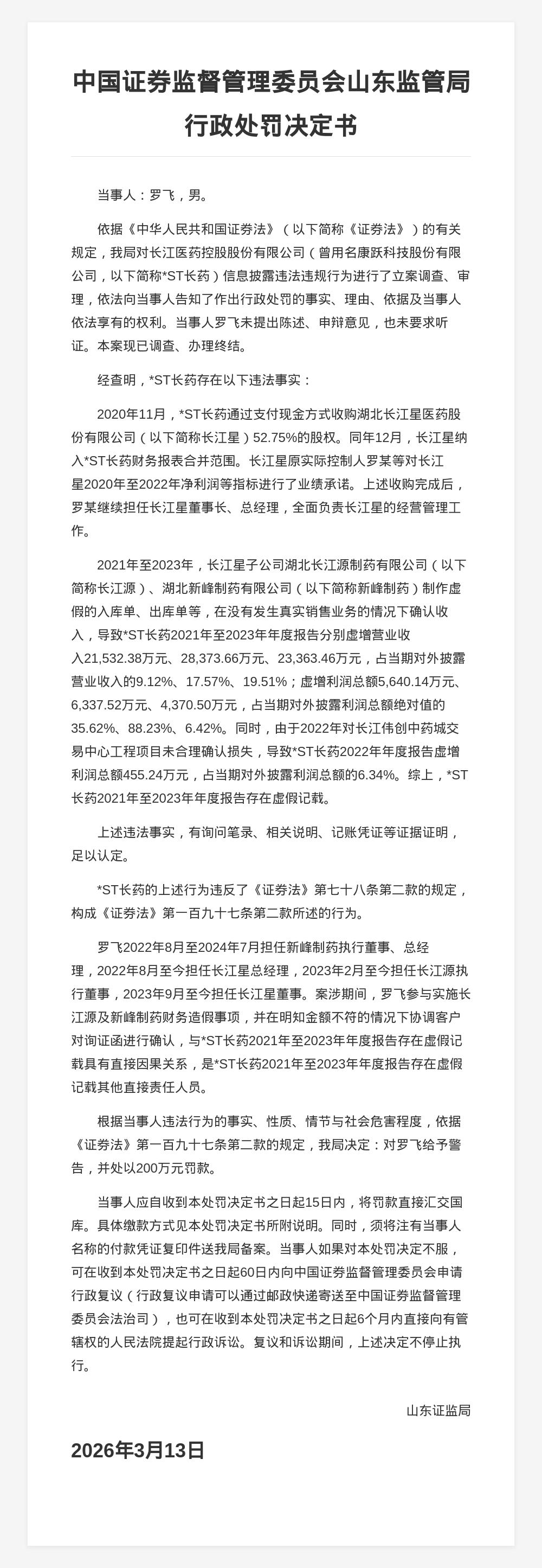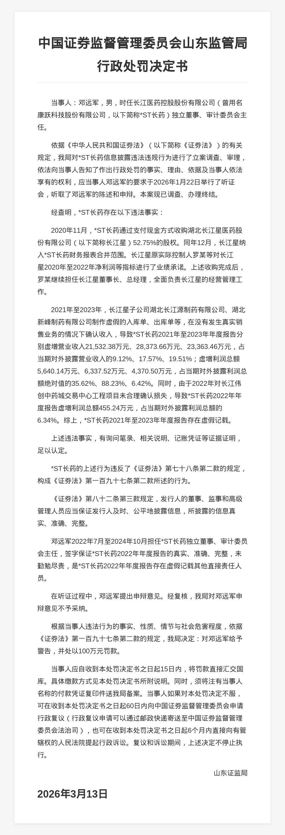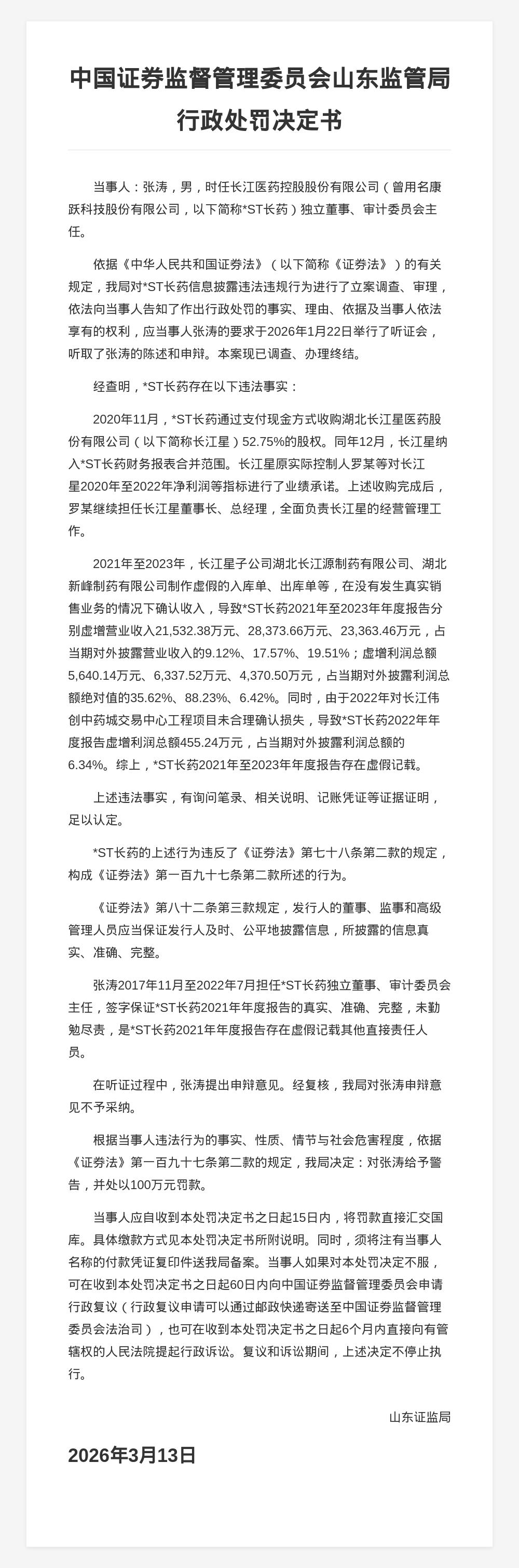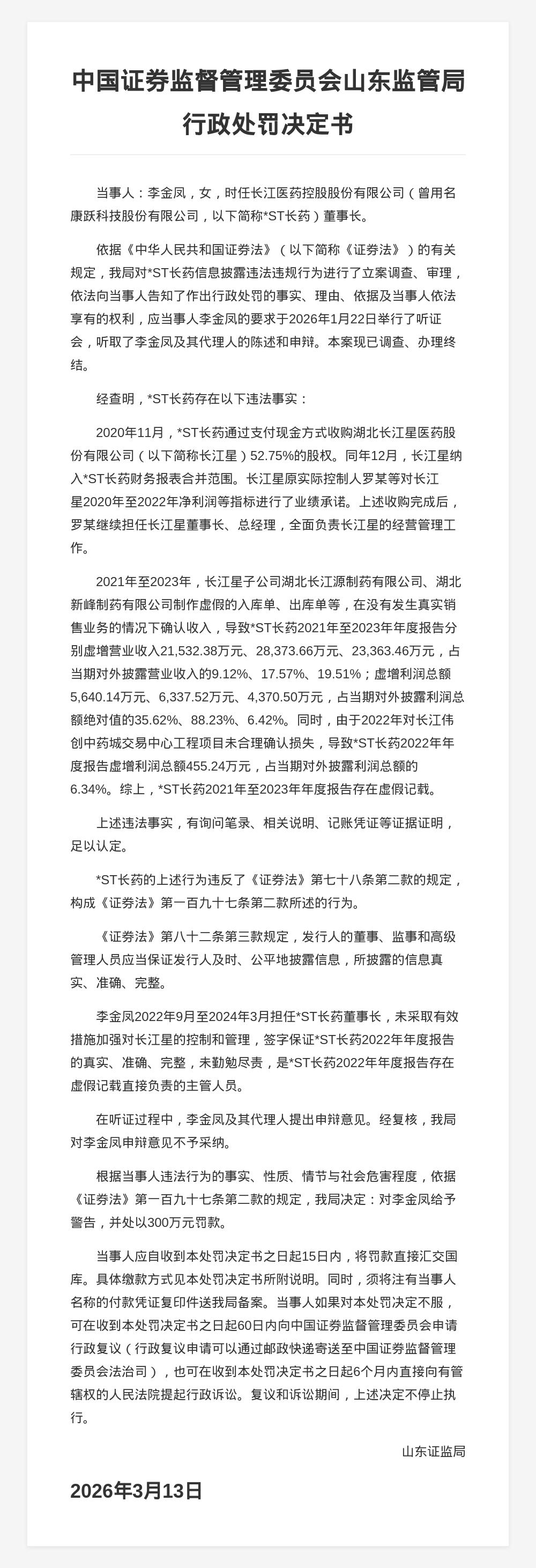 *ST长药多位高管共被罚3100万,涉信息披露违规