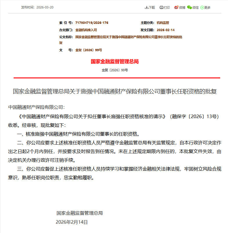 今日,金融监管总局发布批复显示,核准施强中国融通财产保险有限公司(下称“融通财险”)董事长的任职资格。