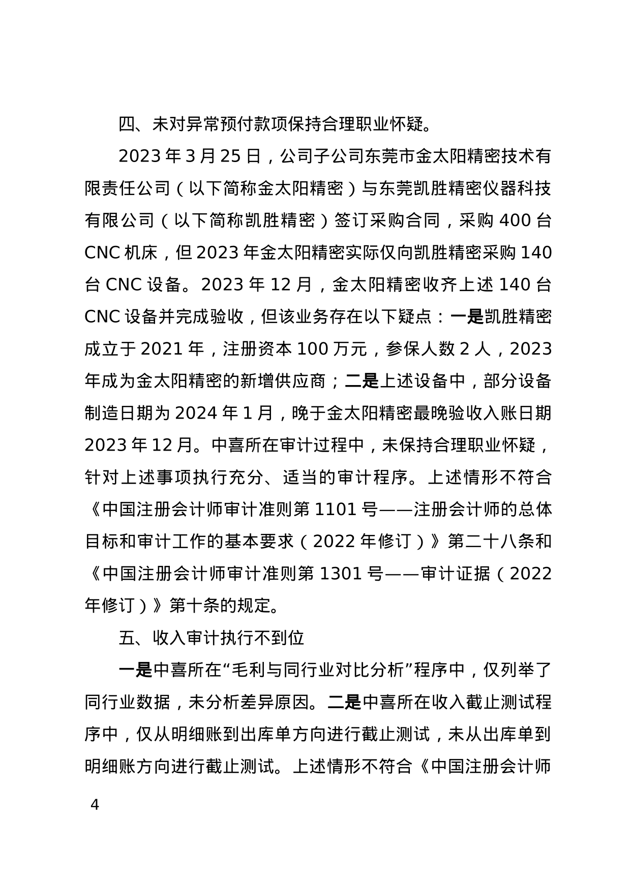 决定书显示,中喜会计师事务所(特殊普通合伙)在对东莞金太阳研磨股份有限公司2023年年报审计工作中存在多项问题。包括风险评估程序执行不充分、控制测试程序执行不到位、函证程序执行不到位、未对异常预付款项保持合理职业怀疑、收入审计执行不到位以及其他问题,如未执行会计分录测试和独立性声明签署日期晚于规定时间。