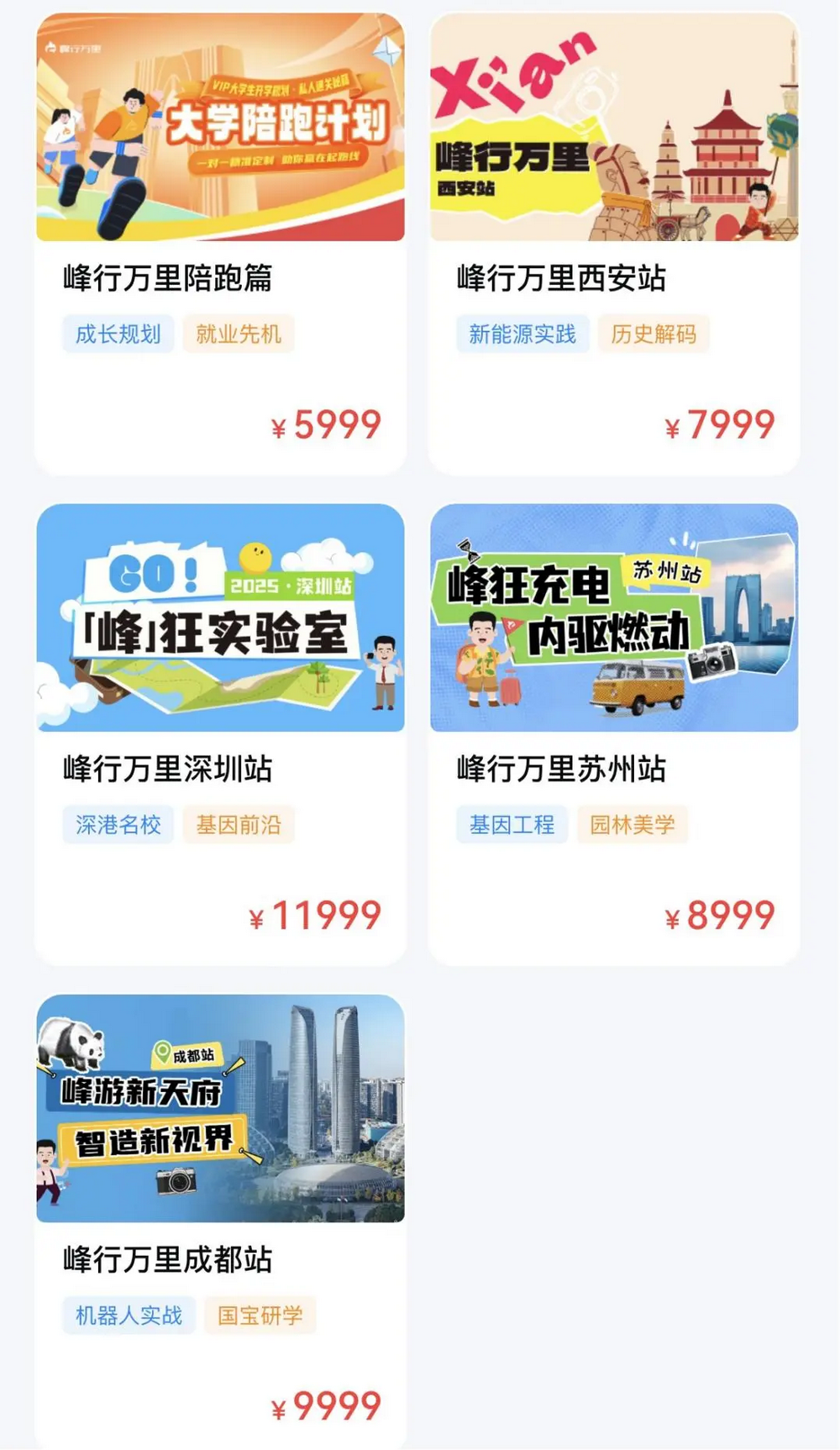 2024年3月,苏州峰峰火火旅行社有限责任公司(目前已注销)、苏州峰峰火火闯九州旅行社有限责任公司相继注册成立,张雪峰悄悄进军游学行业。他在直播间里推出了自己的研学产品。峰学蔚来APP上,一款名为“青春研学季”的项目6天5晚,标价8999元,瞄准的是14岁到18岁的初高中生。