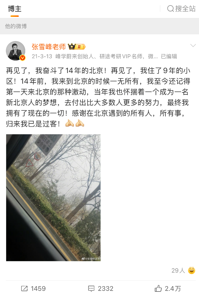 2021年3月,张雪峰发了一条微博:“再见了,我奋斗了14年的北京!……感谢在北京遇到的所有人,所有事,归来我已是过客!”