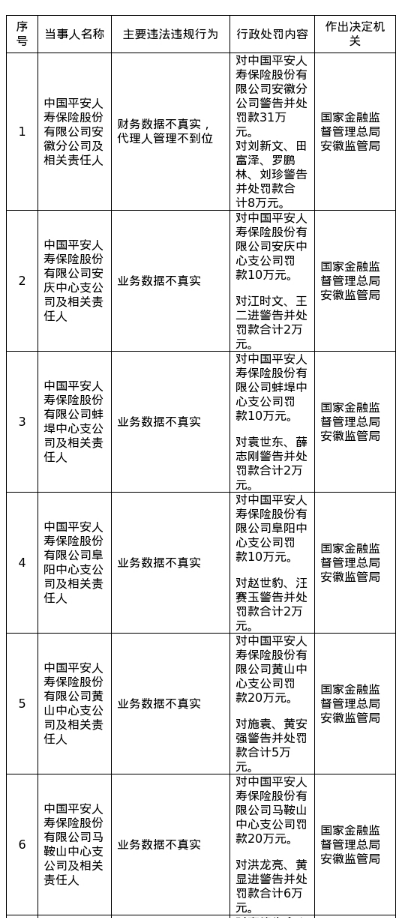 平安人寿安徽分公司被罚31万,安庆、蚌埠等中支因业务数据不真实共被罚70万