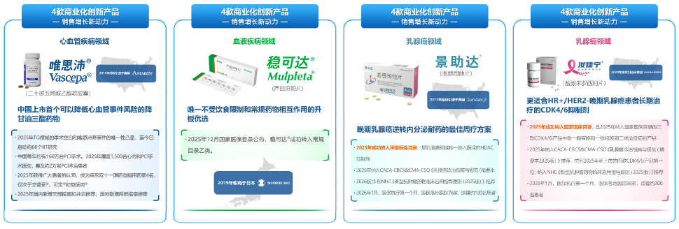 在创新药方面,唯思沛®是中国上市首个可以降低心血管事件风险的降甘油三酯药物,获得全球80余部及中国20余部指南/共识积极推荐。中国每年约有160万台PCI手术,有着巨大的临床需求,2025年唯思沛覆盖1,500名心内科PCI手术医生,惠及约2万名PCI术后患者,在院外渠道,唯思沛®是京东双十一原研血脂用药第4名。