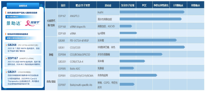 EDP167的HoFH适应症II期临床已于2026年2月启动,有机会成为首个获批HoFH适应症的国产原研siRNA药物。另一个适应症——混合型高脂血症计划于2026年Q3启动 II期临床研究,目前在该适应症的国产siRNA药物中,研发进度位列第二,处于第一梯队。