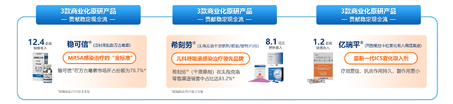 经典原研产品稳可信®作为MRSA感染治疗的“金标准”,2025年销售收入12.4亿元,在万古霉素市场所占份额为78.7%;因其为特殊使用级抗生素,未纳入第十一批国家药品集中采购名录,未来市场空间及竞争优势依旧可观。儿科呼吸道感染治疗领先品牌希刻劳®全年销售收入8.1亿元,其干混悬剂在头孢克洛零售渠道销售中占比83.2%,在头孢克洛类剂袋规格中亦有约75.0%的市场份额。亿瑞平®作为最新一代ICS雾化吸入剂,疗效更佳、抗炎作用持久、副作用更小,与希刻劳在儿童市场具有良好的协同效应。