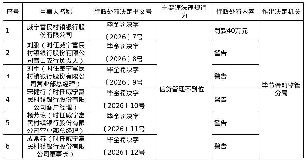 罚单显示,威宁富民村镇银行股份有限公司的主要违法违规事实(案由)为:信贷管理不到位。