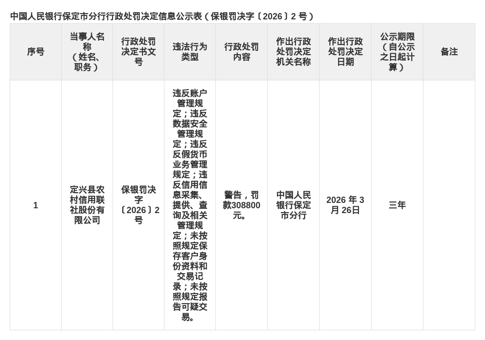 蓝鲸新闻3月31日讯,近日,中国人民银行保定市分行发布了行政处罚决定信息公示表,剑指定兴县农村信用联社股份有限公司。