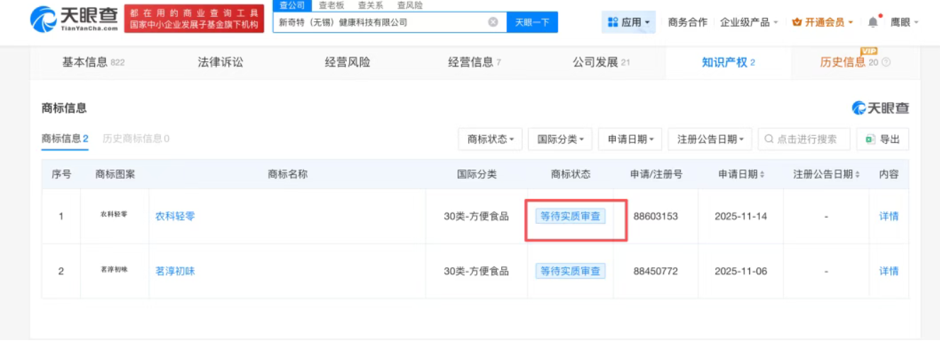 值得注意的是,该公司的农科轻零商标,目前未完成注册,仍处于等待实质审查的过程中。