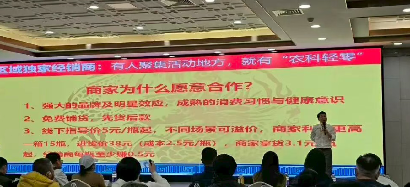 乔先生向蓝鲸记者回忆,现场讲师讲得汗流浃背、慷慨激昂,从产品功效到权威背书,从后期扶持到商家保障,把自家茶饮品牌说得天花乱坠。宣讲刚结束,一群身穿“农科轻零”马甲的工作人员迅速锁定目标,一名工作人员径直走到他身旁,掏出合同开始推销。