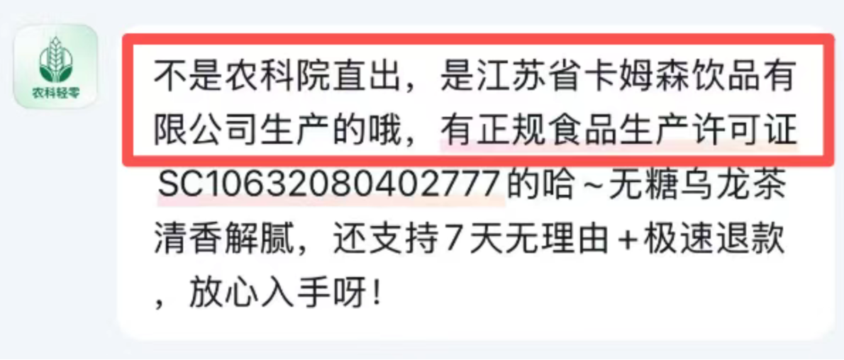然而,官方客服告诉记者,该产品并非农科院直出,而是由江苏省卡姆森饮品有限公司生产。