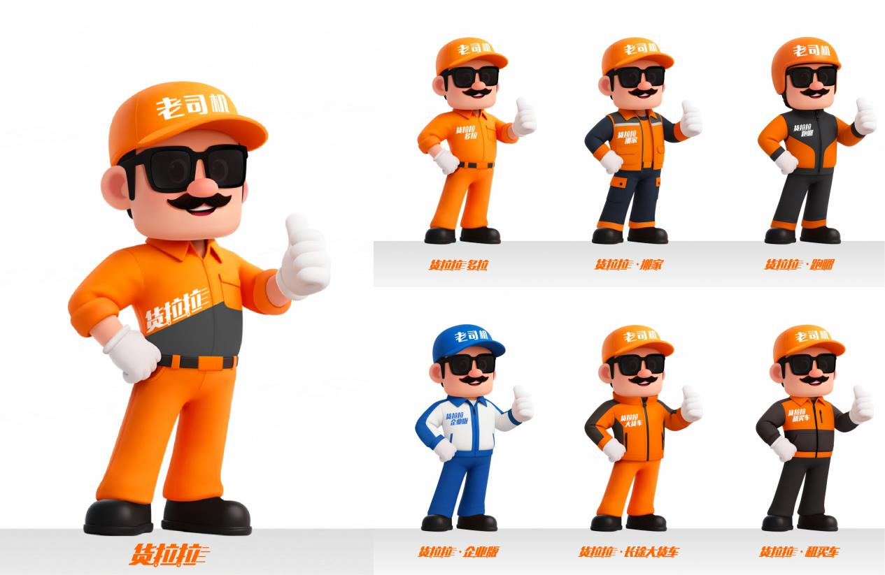 据介绍,货拉拉“老司机”采用近乎1:1的头身比设计,其中橙灰色套装强化了品牌识别,墨镜、帽子、八字胡和点赞手势则意在体现“经验丰富、可靠”的形象特征,整体设计圆润讨喜,既降低了距离感,又强化了记忆点。此外,货拉拉结合自身实际业务场景为老司机衍生出多套穿搭:搬家、跑腿、企业版、长途大货车、租买车、多拉等,保留老司机核心辨识度的同时,又精准对应货拉拉多元化的服务矩阵。