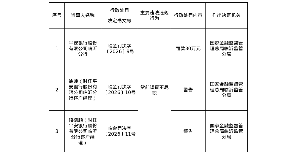 平安银行临沂分行被罚30万,涉贷前调查不尽职