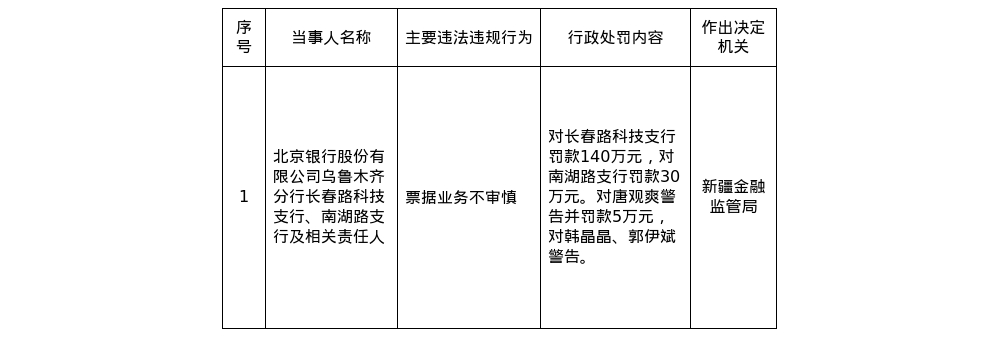 北京银行乌鲁木齐分行两支行共被罚170万,涉票据业务不审慎