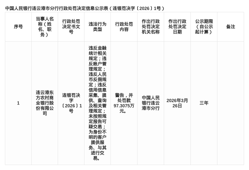 连云港东方农商行被罚97.31万,涉多项金融违规