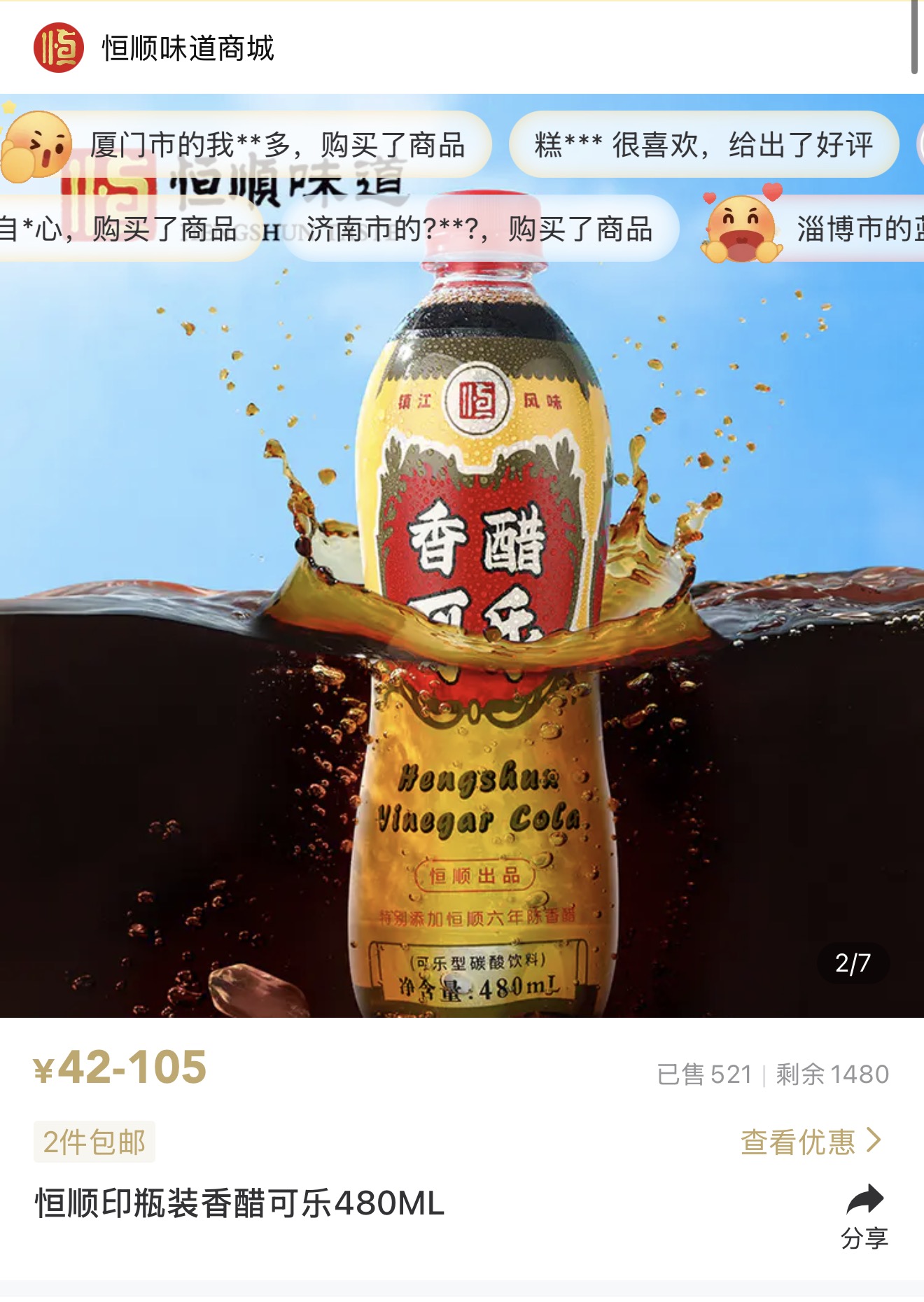 产品信息显示,该产品属于可乐型碳酸饮料,执行标准为GB/T 10792,添加恒顺香醋六年陈,添加量不低于8g/L。4月16日,蓝鲸新闻记者查询“恒顺味道”小程序发现,该产品规格为480ml×6瓶,售价42元,页面显示已售521件。社交平台上,对这款产品的评价也较为分化,有消费者觉得“味道奇奇怪怪”,也有人认为“有特色,挺好喝的”。