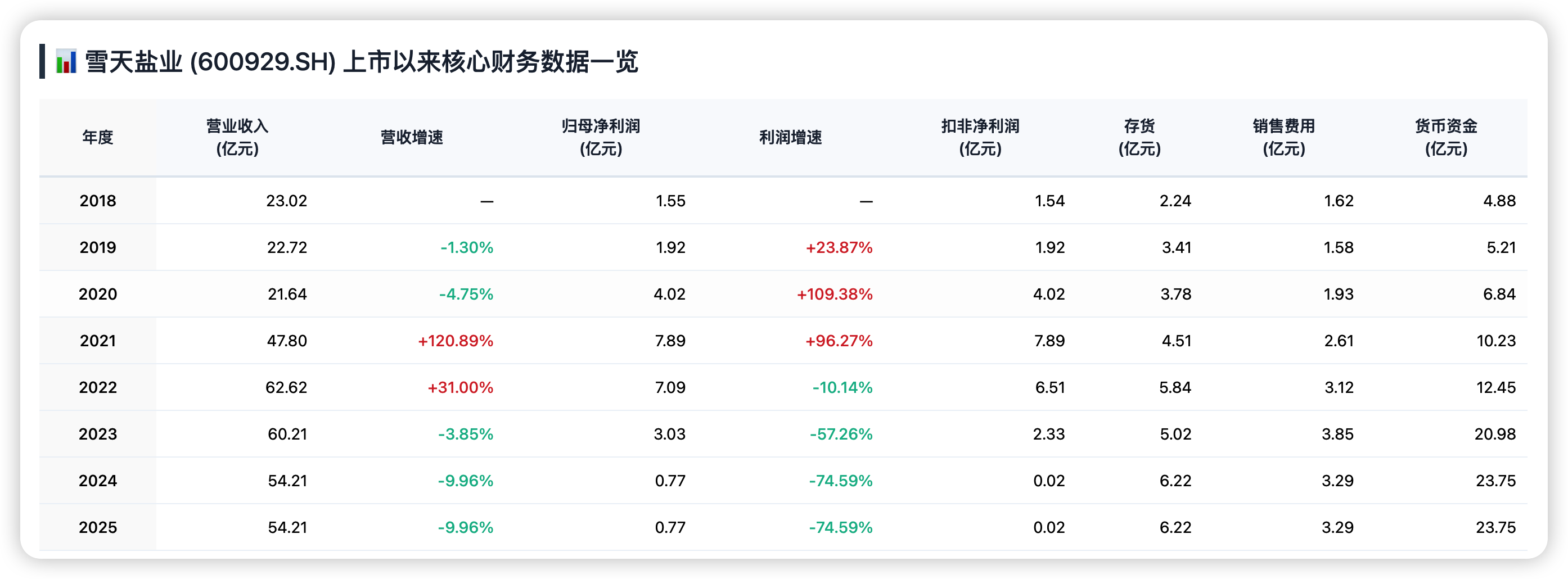 公开资料显示,雪天盐业前身为湖南盐业,2018年3月26日在上交所上市,官方资料将其称为“中国盐改第一股”。从公开年报看,上市首年公司实现营业收入23.03亿元、归母净利润1.42亿元;此后几年,公司业绩大致经历了几波起起落落。