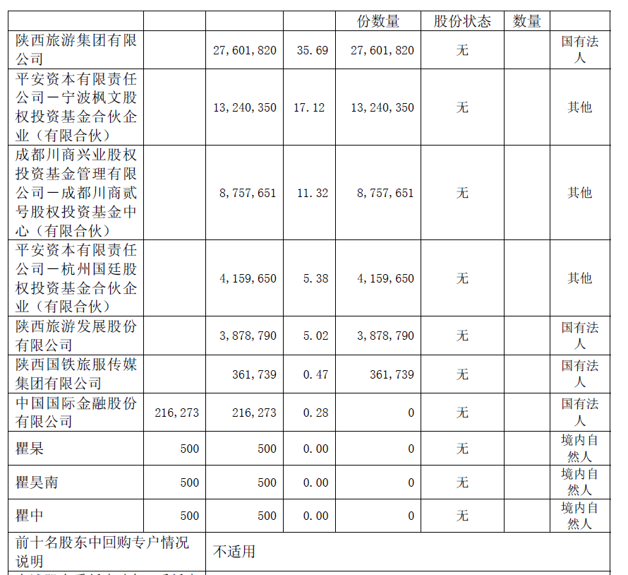 就股东排序情况,陕西旅游回应称,公司根据股东名册的排名顺序填报了2025年年度报告前十名股东,因2025年末公司尚未上市,不存在流通股,因此未填报前十名流通股东(或无限售条件股东)持股情况表。