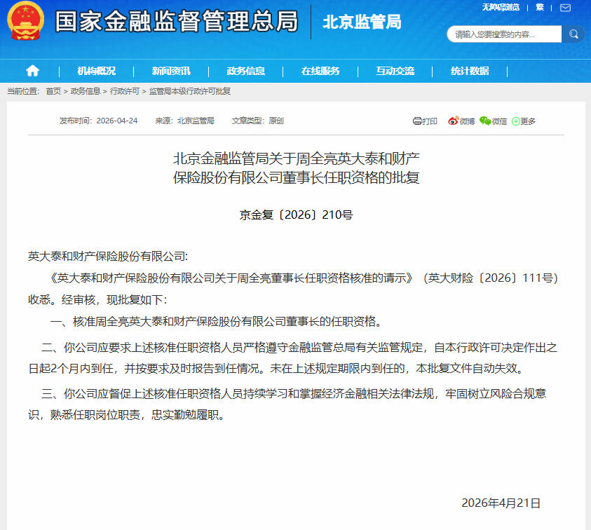 今日,北京金融监管局发布批复显,核准周全亮英大泰和财产保险股份有限公司(下称“英大财险”)董事长的任职资格。值得关注的是,去年2月,周全亮刚履新英大财险总经理,一年后又得以晋升为公司董事长。