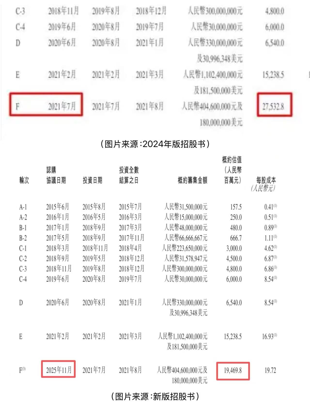 此次第六次递表,圆心科技在招股书中将F轮估值下调,从原来的275.33亿元估值,每股价格28.84元/股,下调至估值195亿,每股成本为19.72元/股,较F轮高点缩水约80亿元。