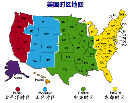 美国横跨西五区至西十区,共六个时区。每个时区对应一个标准时间,从东向西分别为东部时间(Eastern Standard Time,EST)(西五区时间)、中部时间(CST)(西六区时间)、山地时间(MST)(西七区时间)、太平洋时间(西部时间)(PST)(西八区时间)、阿拉斯加时间(AKST)(西九区时间)和夏威夷时间(HST)(西十区时间),按照“东早西晚”的规律,各递减一小时。