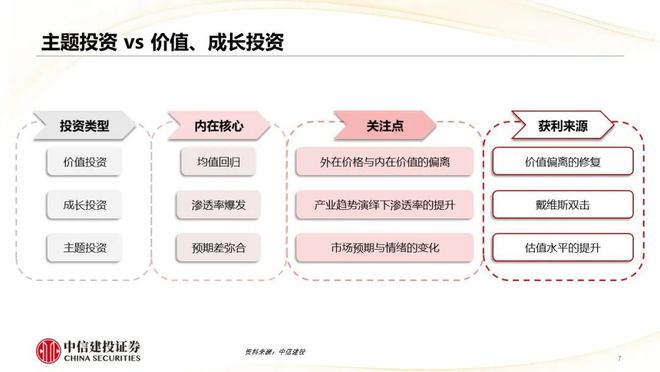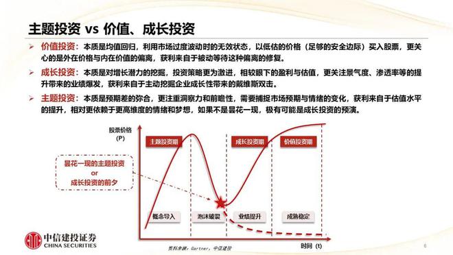 主题投资:本质是预期差的弥合,更注重洞察力和前瞻性,需要捕捉市场预期与情绪的变化,获利来自于估值水平的提升,相对更依赖于更高维度的情绪和梦想,如果不是昙花一现,极有可能是成长投资的预演。