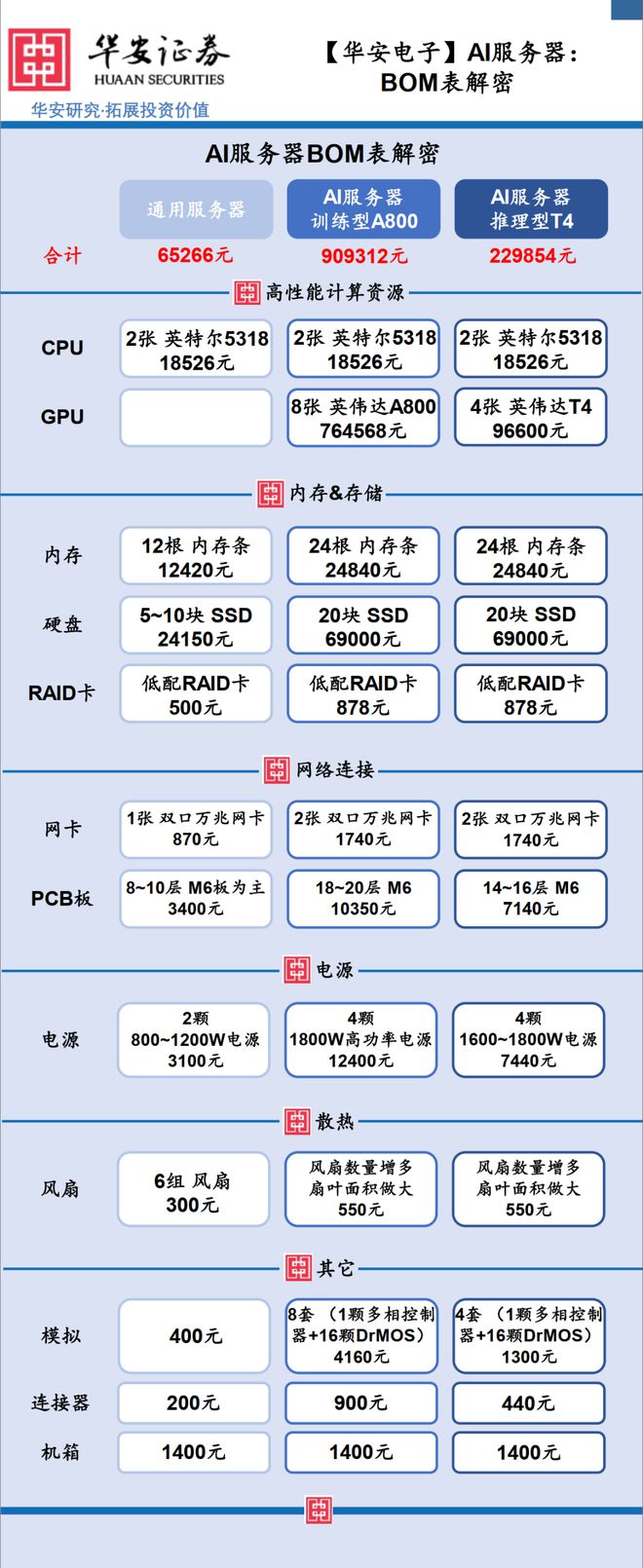 从华安证券最近拆解的AI服务器来看:相对于通用服务器,AI服务器在内存、硬盘、PCB板、模拟这些细分部分价值含量提升较大。(英伟达的GPU除外)