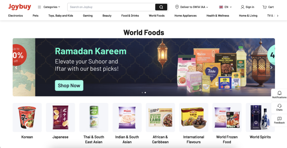 除了中国商品,Joybuy还引入了欧洲本土大牌、国际品牌,也包括以及南亚、中东等世界食品和商品。这种多元化的商品结构能够满足不同文化背景消费者的需求。