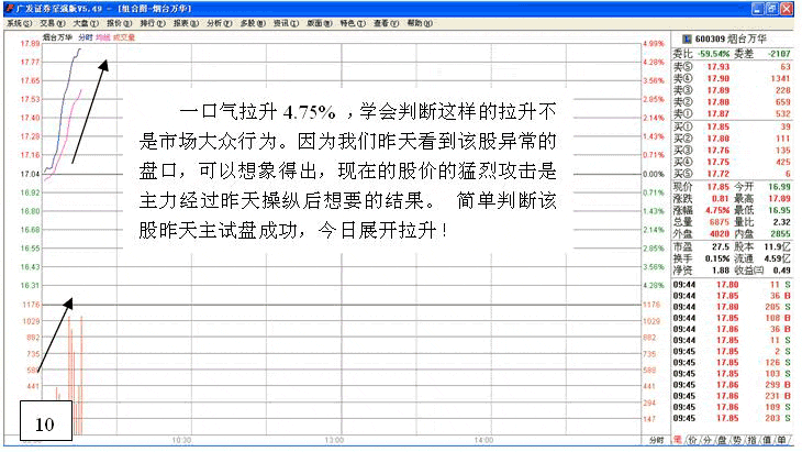 试盘的目的很多,方法也很多,下面介绍一种拉升前相对比较简单的试盘盘口"单笔打压试盘"盘口。