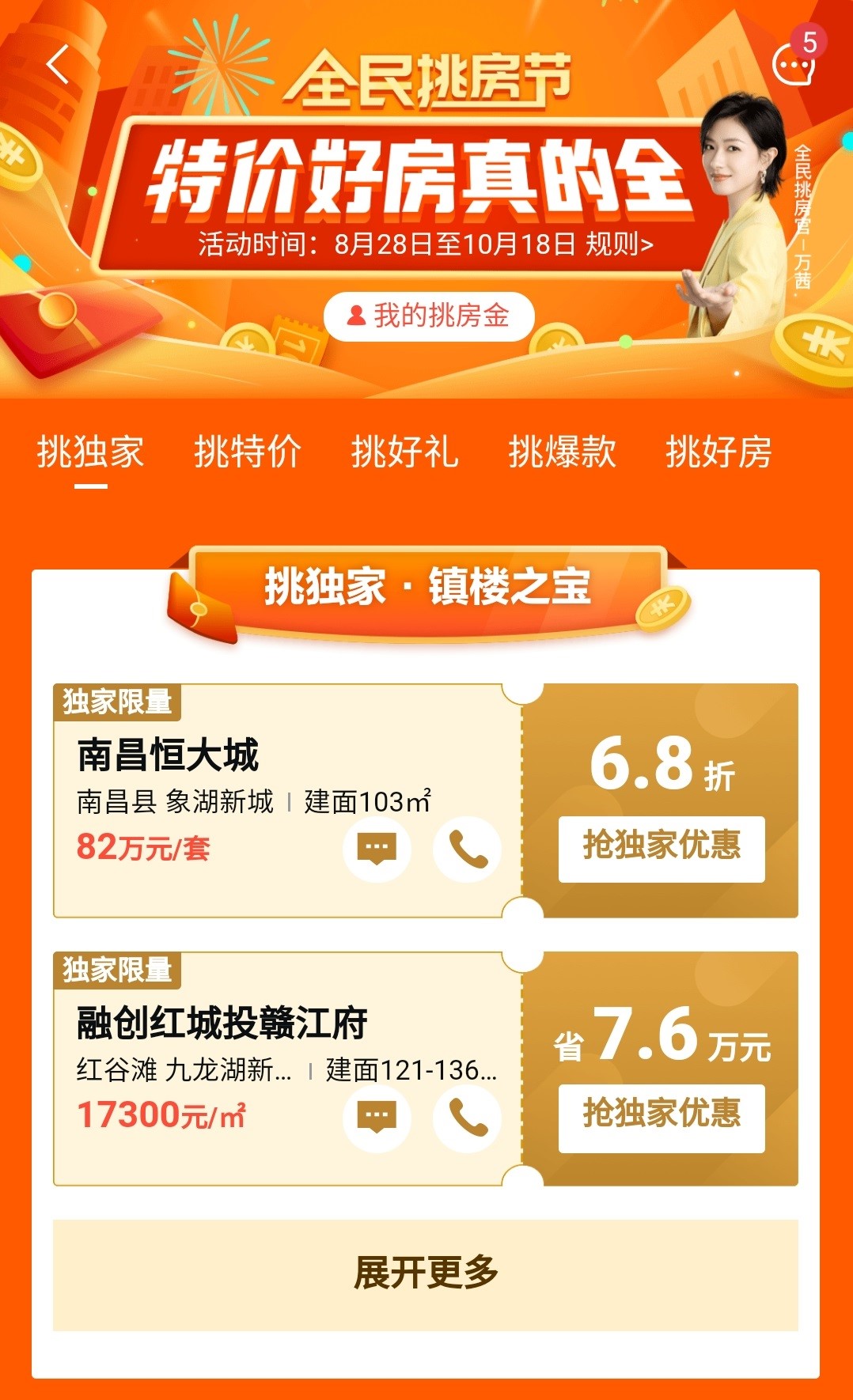 值得一提的是,在这场全民狂欢的挑房盛宴中,58同城、安居客除了现金券、满减券、折扣券、礼品券外,对于成交的用户平台将再补贴一份豪礼相送。“全民挑房节”新房分会场还携手碧桂园、万科、金地集团、中国金茂、世茂、华润置地、招商蛇口、中南集团、金科、龙光地产等品牌房企开启全城特卖,多盘联动,每日特价房、独家限量房让利给广大用户。