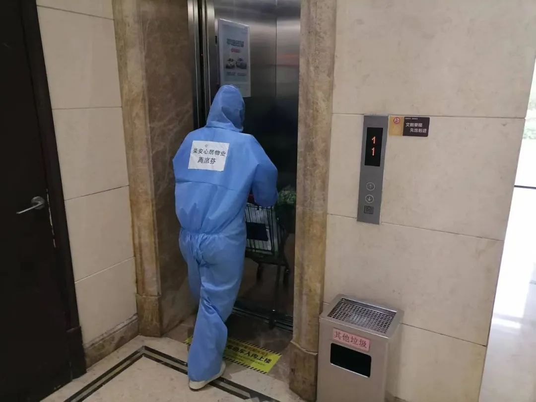 封控期间,业主最担心的就是物资供应,周惠芬每天做得最多的事情就是搬运物资并送物资上门。前几天天气炎热,穿着防护服的她常常是浑身湿透,面罩也起了一层白雾。