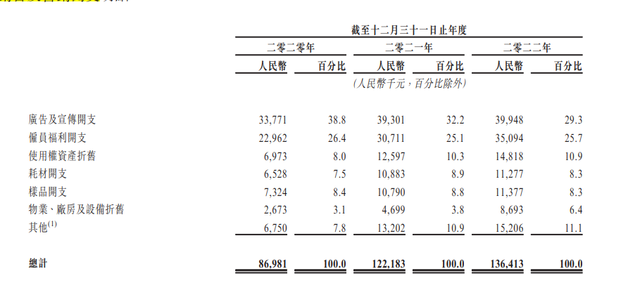 另据招股书,澜沧古茶在营销活动方面产生了大额的销售及营销开支。2020年-2022年,澜沧古茶的销售及营销开支分别为人民币8700万元、人民币1.2亿元及人民币1.36亿元。同期,广告及宣传开支分别为人民币3380万元、人民币3930万元及人民币3990万元,分别占总收益的8.3%、7%及8.6%。