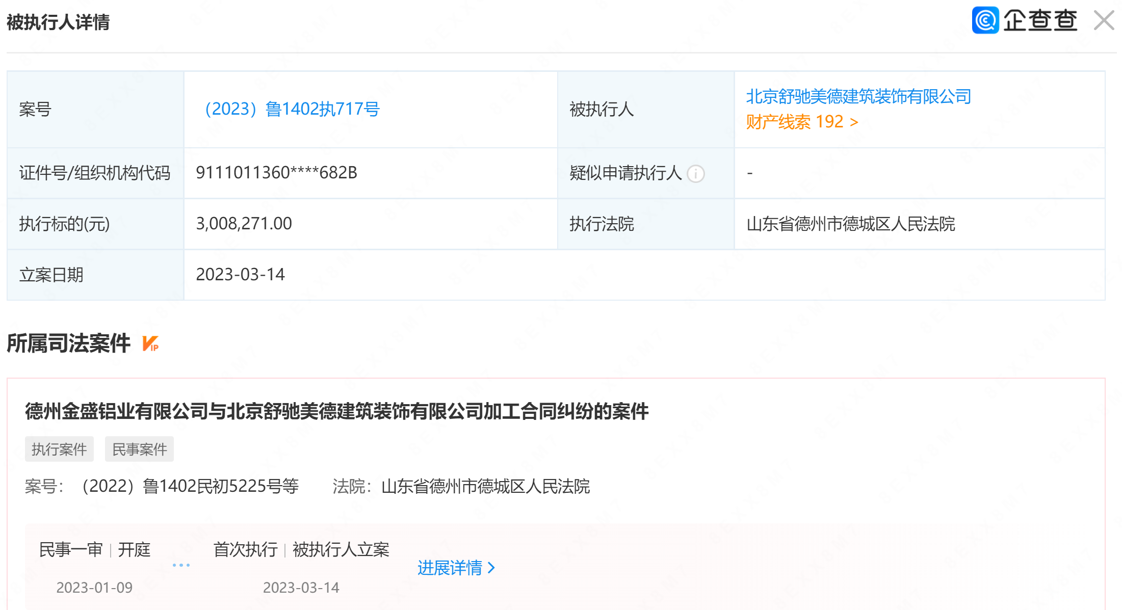 执行信息公开网显示案号为(2023)鲁1402执717号,立案时间为2023年3月14日,执行标的约为300.83万元,执行法院为山东省德州市德城区人民法院。