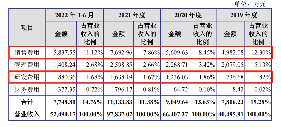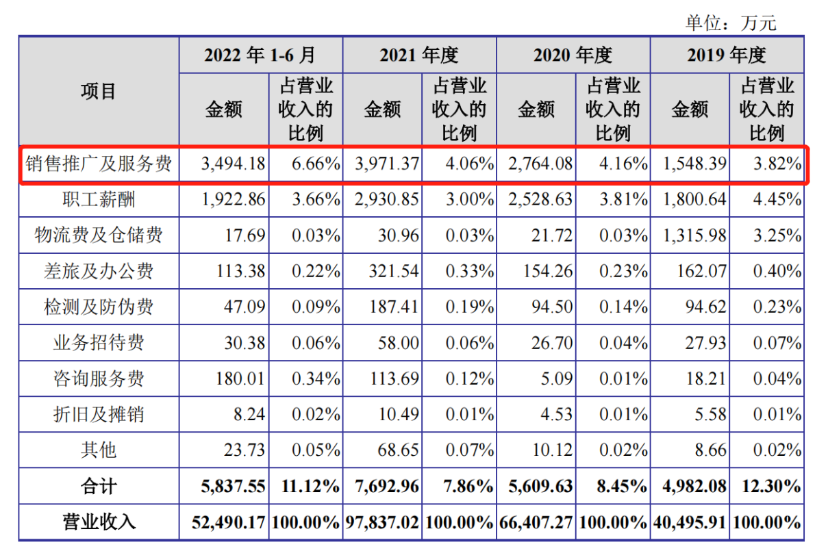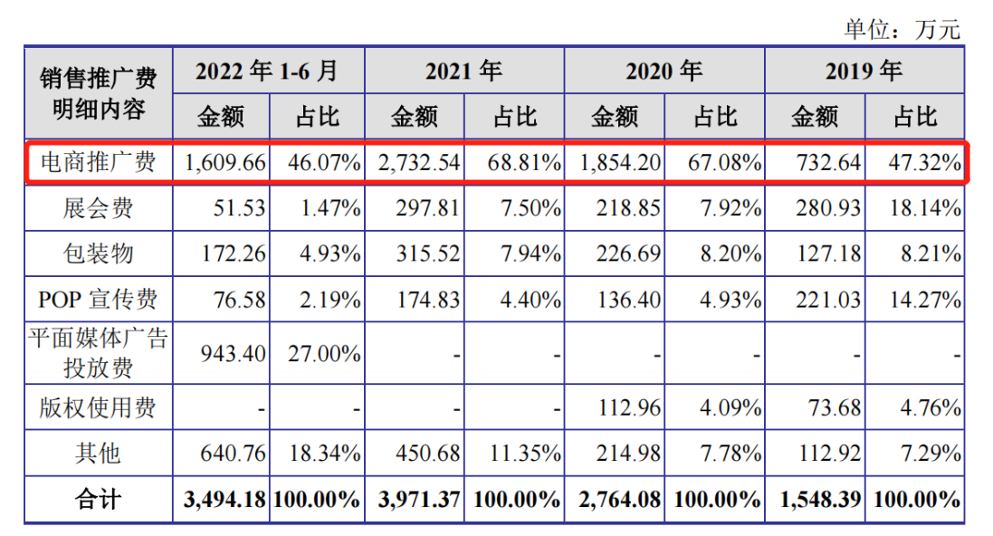 销售推广及服务费中,电商推广费又占比最高。2019-2022年上半年,公司电商推广费金额分别为732.64万元、1854.20万元、2732.54万元、1609.66万元,占比分别为47.32%、67.08%、68.81%、46.07%。