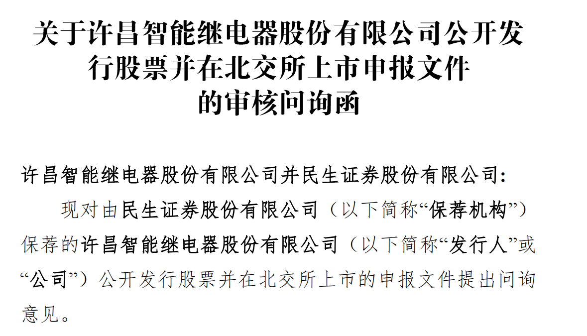 乐居财经 邓如菲 4月14日,许昌智能继电器股份有限公司(以下简称“许昌智能”)收到北交所审核问询函。