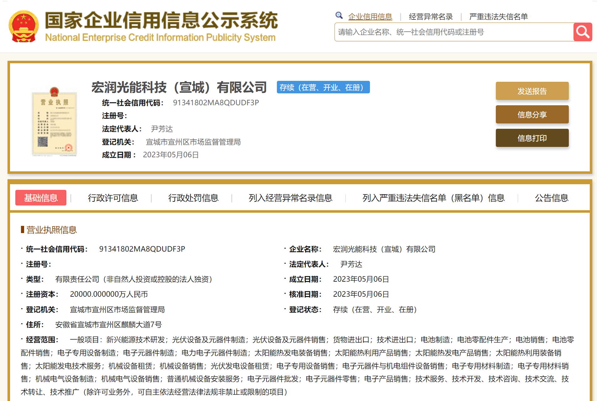 宏润光能科技(宣城)有限公司成立于2023年5月6日,法定代表人为尹芳达,注册资本为2亿元,经营范围包括新兴能源技术研发;光伏设备及元器件制造;光伏设备及元器件销售;货物进出口;技术进出口等。
