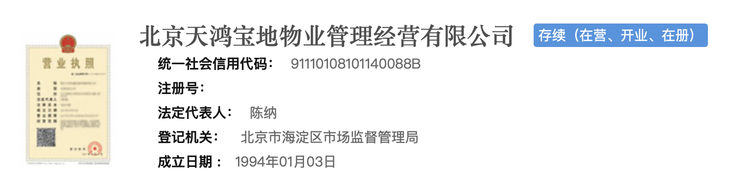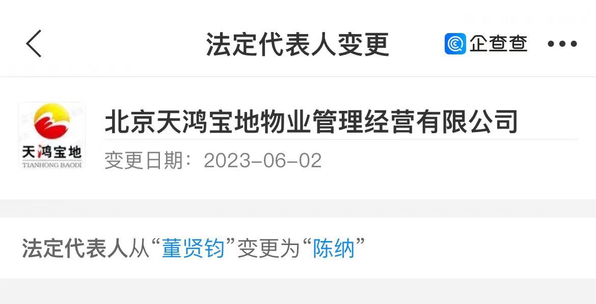 乐居财经 吴文婷 6月2日,据企查查,北京天鸿宝地物业管理经营有限公司(以下简称“天鸿宝地物业”)法人代表发生变更,由董贤钧变更为陈纳。