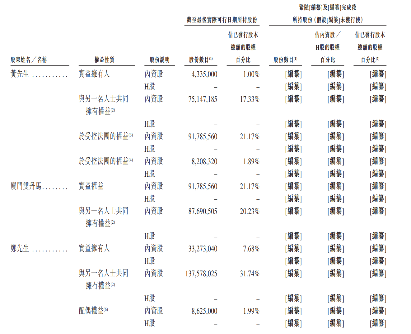 于往绩记录期间,创始人、董事长兼执行董事黄健、副董事长兼执行董事郑文滨、总经理兼执行董事李有泉及黄健控制的实体厦门双丹马(连同黄健、郑文滨及李有泉称为“一致行动人士”)一致行动并为控股股东。此外,根据上市规则,金燕腾飞有限合伙(黄健为其普通合伙人)及薛凤英(郑文滨的配偶)亦被视为控股股东。截至最后实际可行日期,根据上市规则,控股股东合共拥有燕之屋已发行股总额约41.40%。