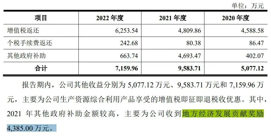 招股书显示,天富龙2020年、2021年及2022年分别实现营业收入24.86亿元、28.57亿元、25.76亿元;分别实现归母净利润4.02亿元、4.5亿元及3.58亿元。乐居财经《预算IPO》发现,2021年天富龙的利润达到最高值,因为有一笔飞来的收入,它获得地方经济发展贡献奖励 4,385.00万元。