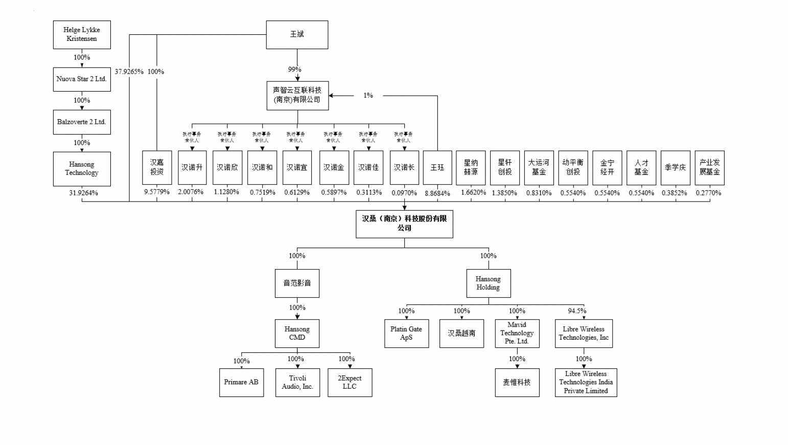 截至本招股说明书签署日,除直接持有公司37.93%的股份外,王斌还通过汉嘉投资间接控制公司9.58%的股份,王斌实际控制的声智互联通过担任汉诺升、汉诺欣、汉诺和、汉诺宜、汉诺金、汉诺佳和汉诺长的执行事务合伙人的方式能够间接控制公司5.50%股份;王斌与Helge Lykke Kristensen系夫妻关系,Helge Lykke Kristensen 通过Hansong Technology间接控制公司31.93%的股份。因此,王斌和Helge Lykke Kristensen合计控制公司 84.93%的股份。