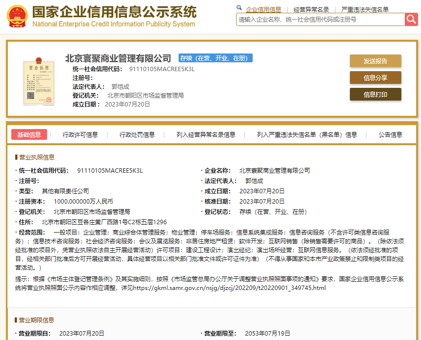 据乐居财经查阅,北京寰聚商业管理有限公司成立于2023-07-20,法定代表人为郭恺成,注册资本1000万元,公司经营范围包括企业管理;商业综合体管理服务;物业管理;停车场服务等。公司目前由杭州杯盏商业管理有限公司持股51%,九桓置业发展(北京)有限公司持股49%。