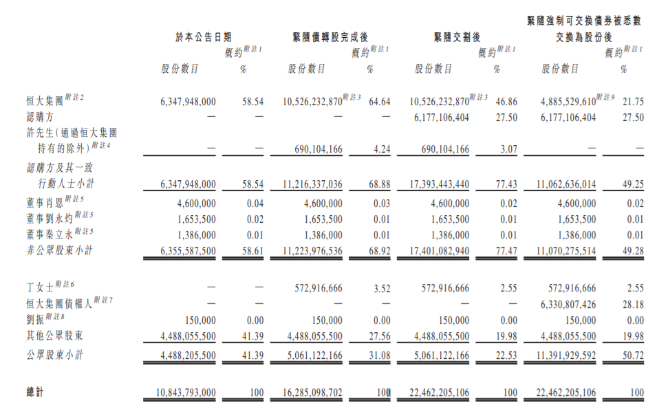 恒大汽车是许家印推动恒大债务重组的重要筹码,在最初计划中,恒大汽车将把分别欠恒大、许家印的26.5亿港元、17.68 亿美元的贷款,以每股3.84港元,转换为恒大汽车的新股。同时,许家印妻子丁玉梅向恒大汽车提供的22亿港元贷款,以同样的价格转换为新股份,但不涉及债务重组。