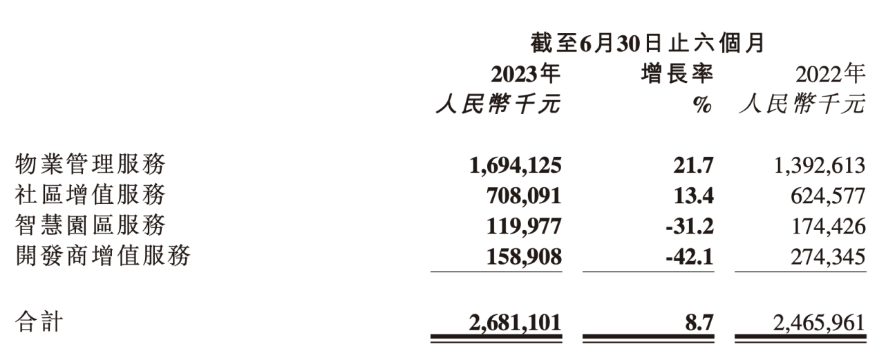其中,作为核心业务的物业管理服务和社区增值服务,在收入层面均达到了两位数的同比增长,增长率分别为21.7%、13.4%;两项核心业务的营收占比约89.6%,毛利占比约91.8,分别较上一年同期分别增长6.4个百分、5.5个百分点。