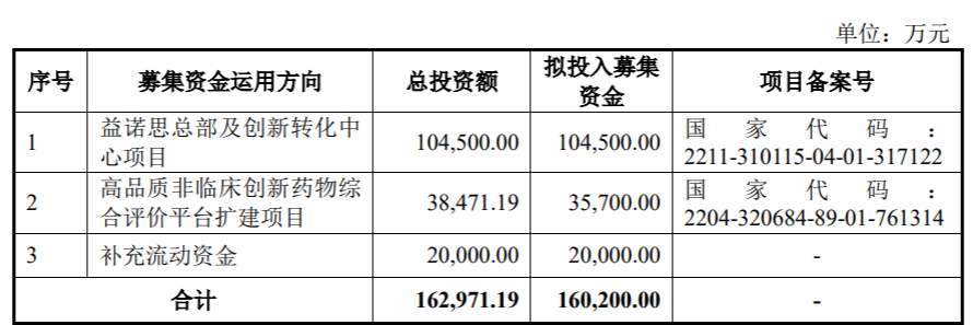 招股书显示,益诺思拟募集资金16.02亿元,分别用于益诺思总部及创新转化中心项目、高品质非临床创新药物综合评价平台扩建项目、补充流动资金。
