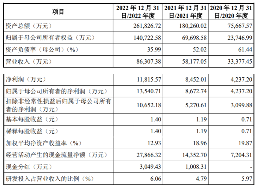 业绩方面,2020年至2022年(以称“报告期内”),益诺思实现营业收入分别为33,377.45万元、58,177.05万元和86,307.38万元;实现归属于母公司所有者的净利润分别为4,237.20万元、8,672.74万元和13,540.71万元。