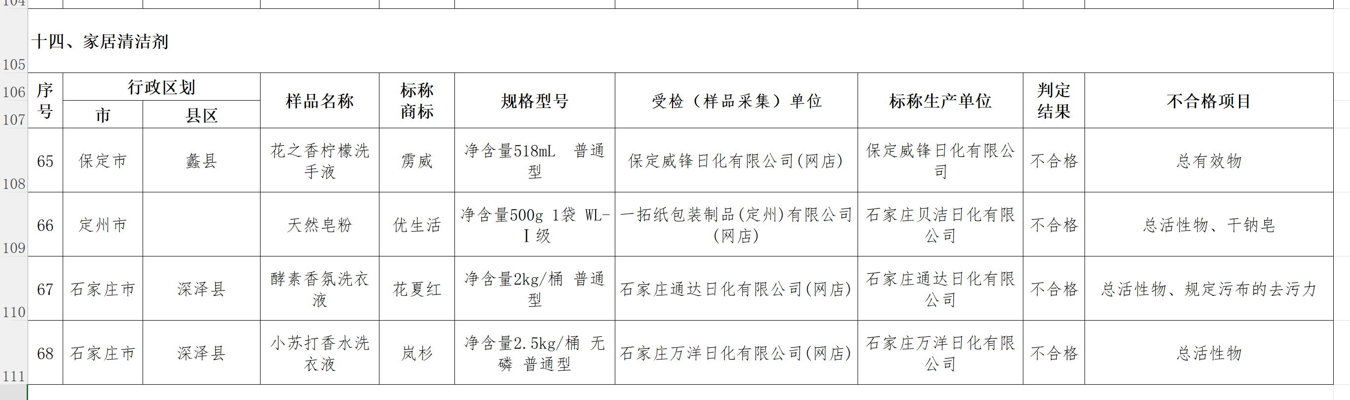 其中,抽检家居清洁剂产品,发现不合格样品4批次。标称生产单位为保定威锋日化有限公司,规格型号为净含量518mL ,普通型的一款花之香柠檬洗手液;标称生产单位为石家庄贝洁日化有限公司,规格型号为净含量500g 1袋 WL-Ⅰ级的天然皂粉;标称生产单位为石家庄通达日化有限公司,规格型号为净含量2kg/桶,普通型的酵素香氛洗衣液;以及标称生产单位为石家庄万洋日化有限公司,规格型号为净含量2.5kg/桶,无磷,普通型的小苏打香水洗衣液被检出不合格。不合格项目包括总有效物、总活性物等。