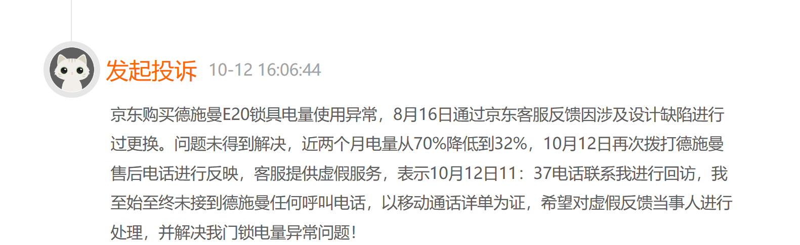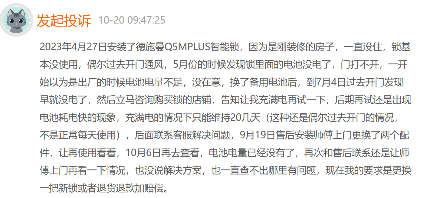 德施曼智能锁频遭投诉,被曝耗电量异常、维修费用高