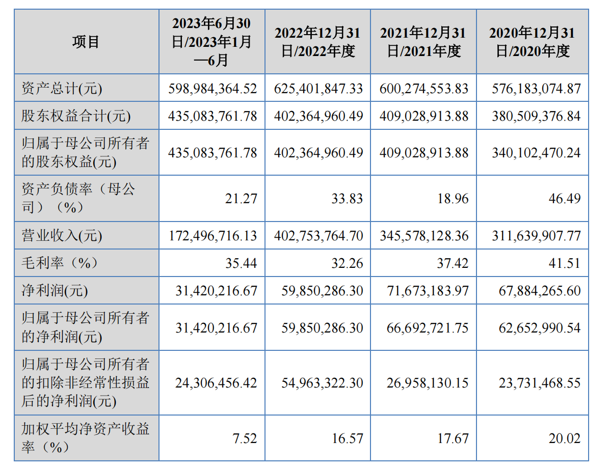 2020-2023年上半年,公司营业收入分别为3.12亿元、3.46亿元、4.03亿元、1.72亿元,归属于母公司所有者的净利润分别为6265.3万元、6669.3万元、5985万元、3142万元。其中,公司营业收入中境外销售金额分别为 3,487.77 万元、8,802.12万元、8,725.00 万元、1,879.89 万元,占营业收入的比例分别为 11.19%、25.47%、21.66%、10.90%。公司产品境外销售区域主要包括俄罗斯、土耳其、韩国、越南等地区。