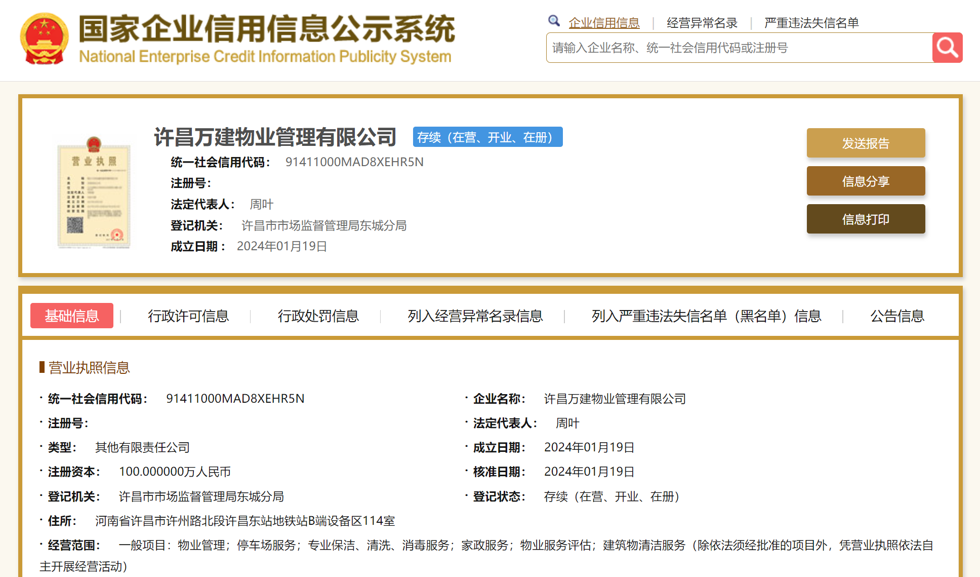 许昌万建物业管理有限公司成立于2024年1月19日,法定代表人为周叶,注册资本为100万元,经营范围为物业管理;停车场服务;专业保洁、清洗、消毒服务;家政服务;物业服务评估;建筑物清洁服务。