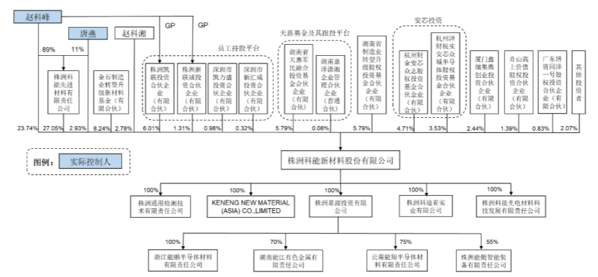 截至本招股说明书签署日,赵科峰、唐燕夫妇二人分别直接持有公司23.74%、2.93%的股份,通过持有科能先进100%的股权控制公司27.05%的股份。此外赵科峰担任株洲凯联和株洲新联诚两个平台的执行事务合伙人,通过株洲凯联间接控制公司6.01%的股份,通过担任株洲新联诚间接控制公司1.31%的股份。