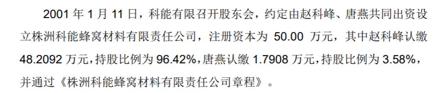 据招股书披露,科能新材创办于2001年1月,由赵科峰、唐燕夫妇共出资50万元设立,其中货币出资28.52万元,实物出资21.48万元。
